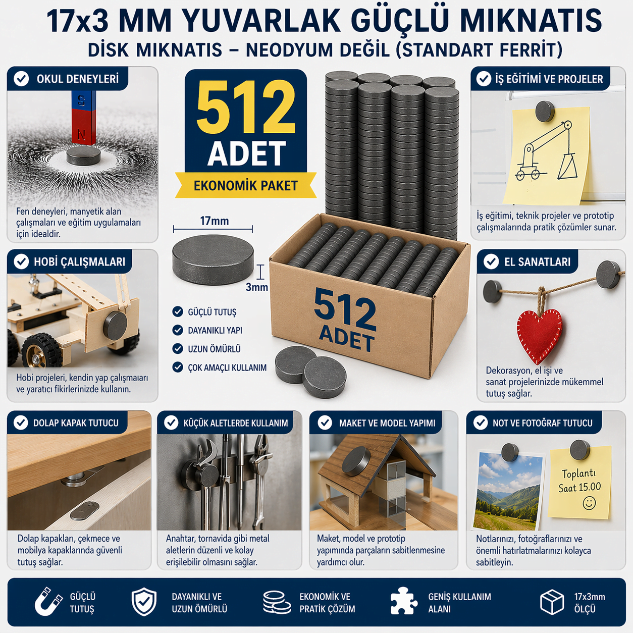Bu mıknatıs neodyum değildir, klasik ferrit yapıda standart mıknatıstır. Bu sayede güvenli ve dengeli bir manyetik kuvvet sunar. Özellikle okul deneyleri, iş eğitimi projeleri, hobi çalışmaları, el sanatları ve basit manyetik uygulamalar için ideal bir üründür.
